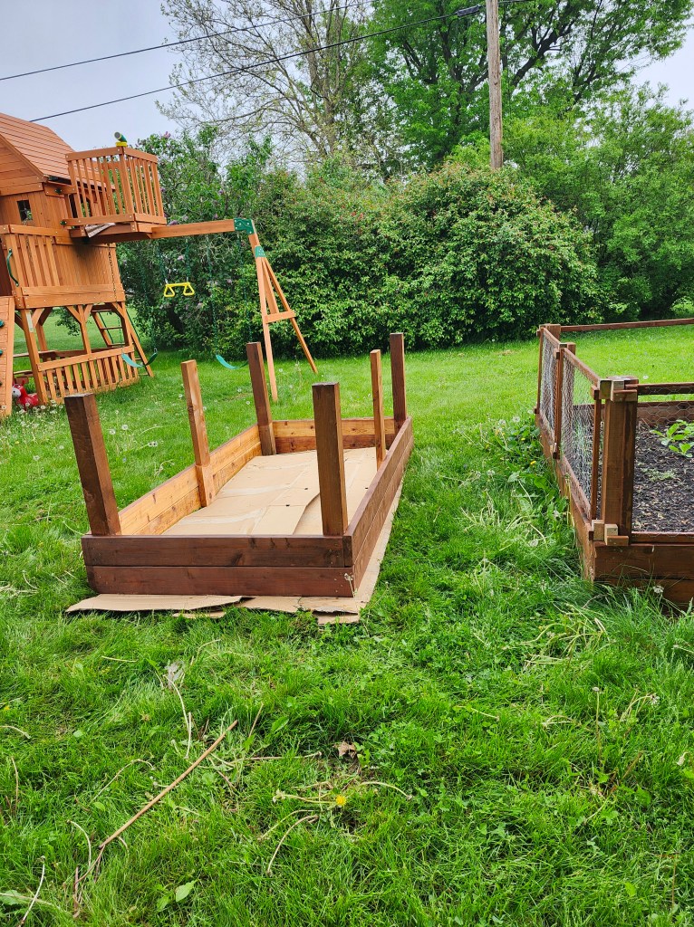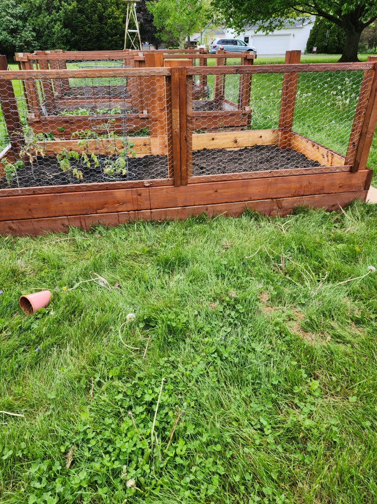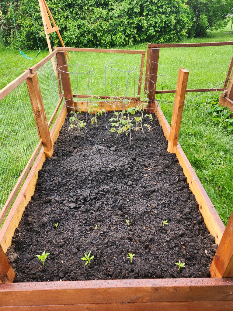 To place the new garden bed first I prepared the area by laying down cardboard to keep the grass from coming through. The garden bed was placed on top of the cardboard and filled with soil. This was a lot of work but well worth it. With the bed prepared our tomatoes had a place to be planted.